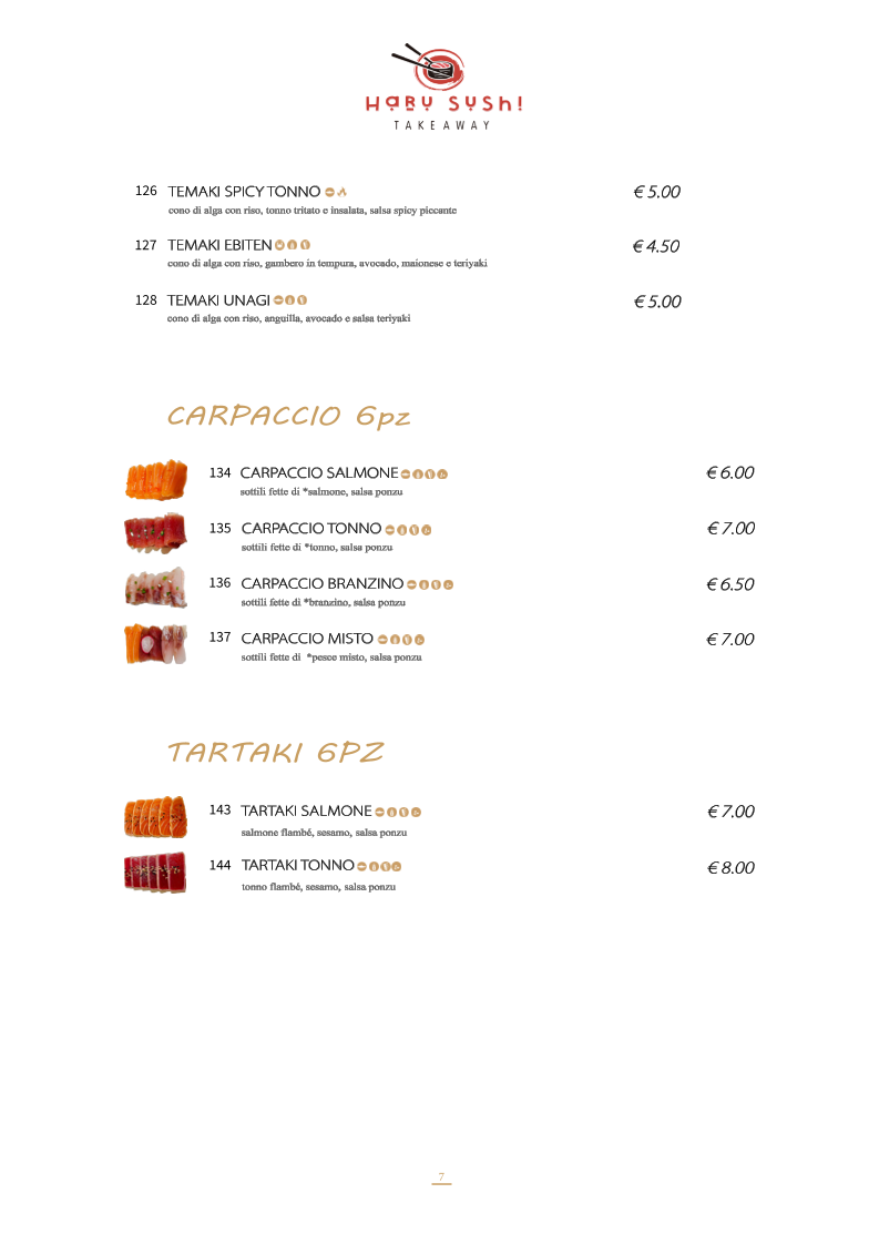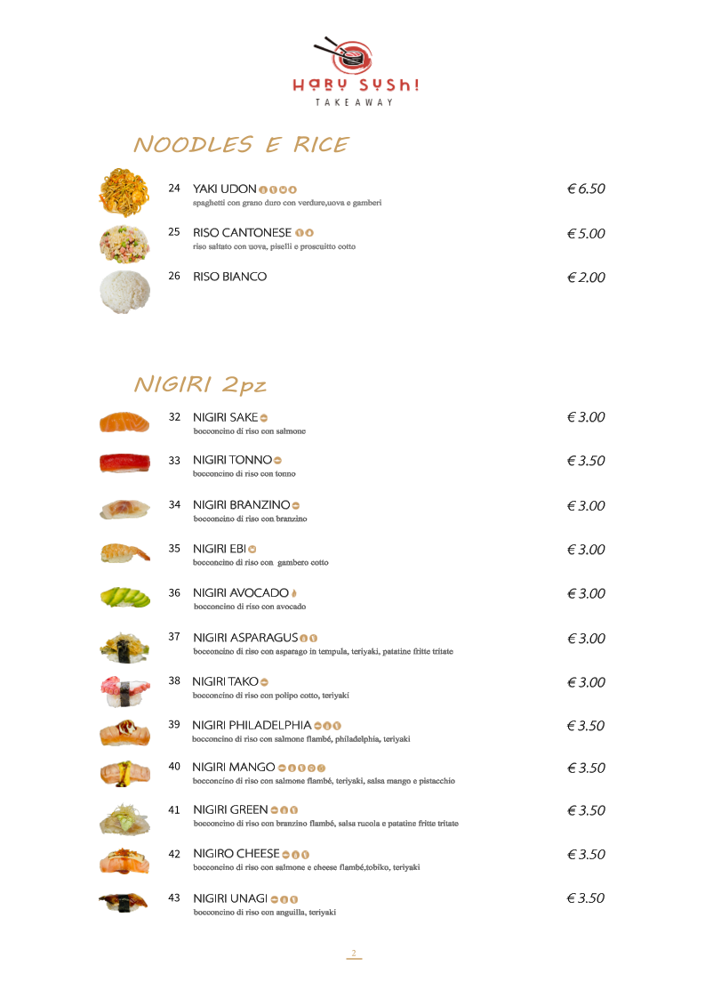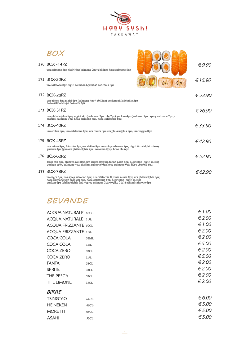 un tiger 8pz, ura spicy salmone 8pz, una california 8pz, ura miura 8pz, ura philadelphia 8pz, hoso salmone 6pz, hoso ebi 6pz, hoso california 6pz, nigiri 8pz (nigiri misto) gunkan 6pz (philadelphia 2pz +spicy salmone2pz +tobiko 2pz) sashimi salmone 6pz